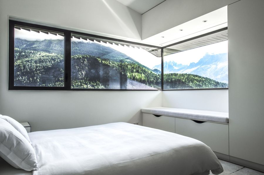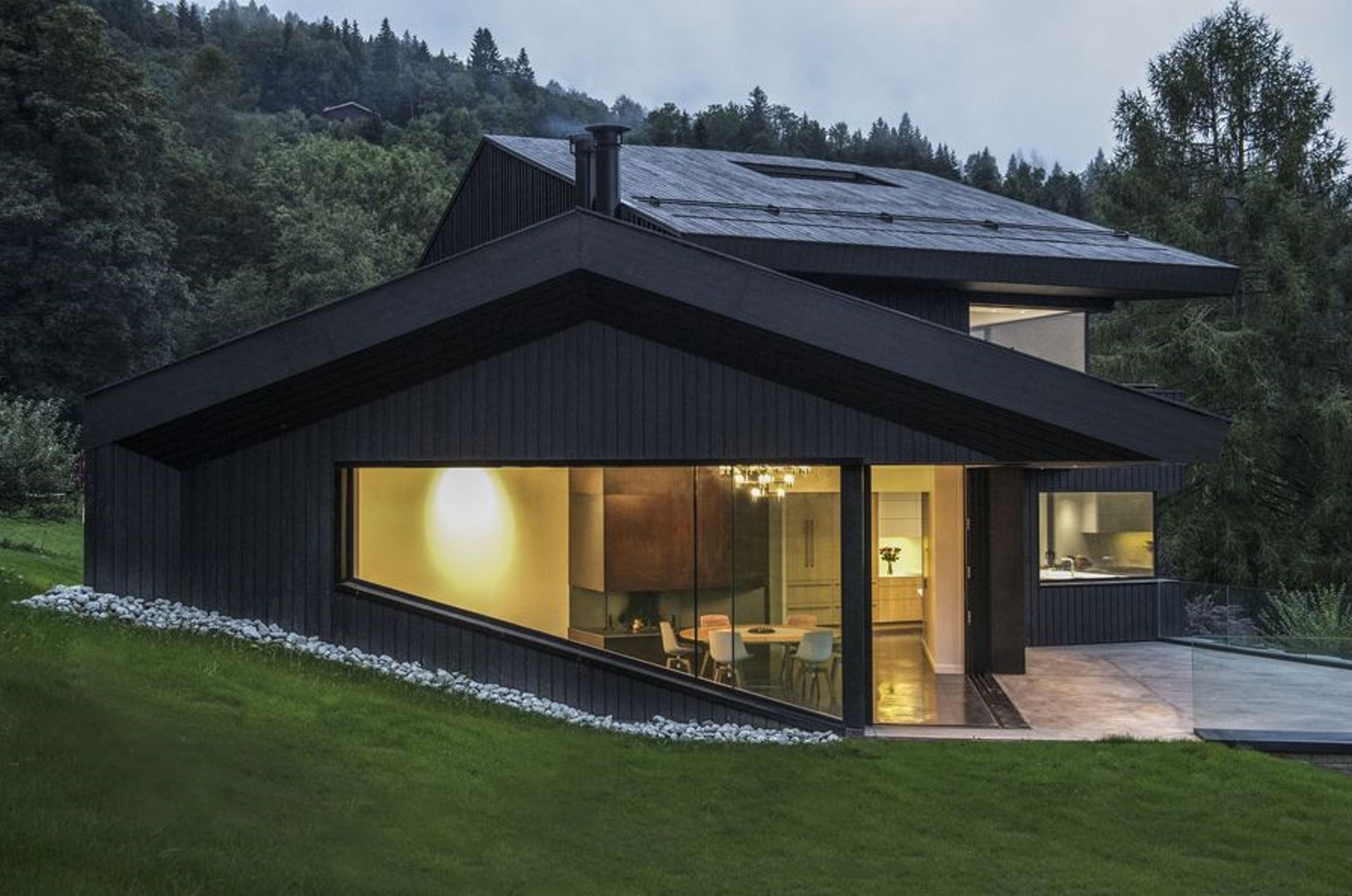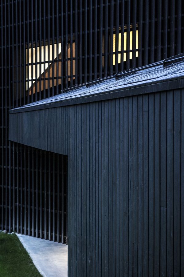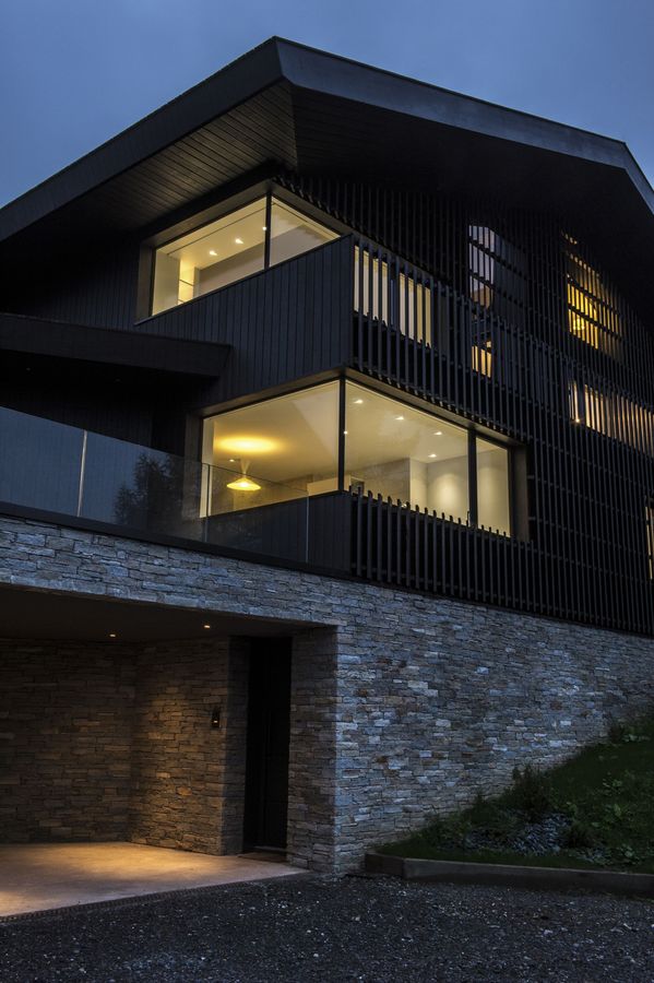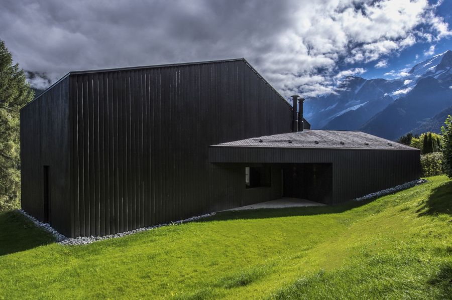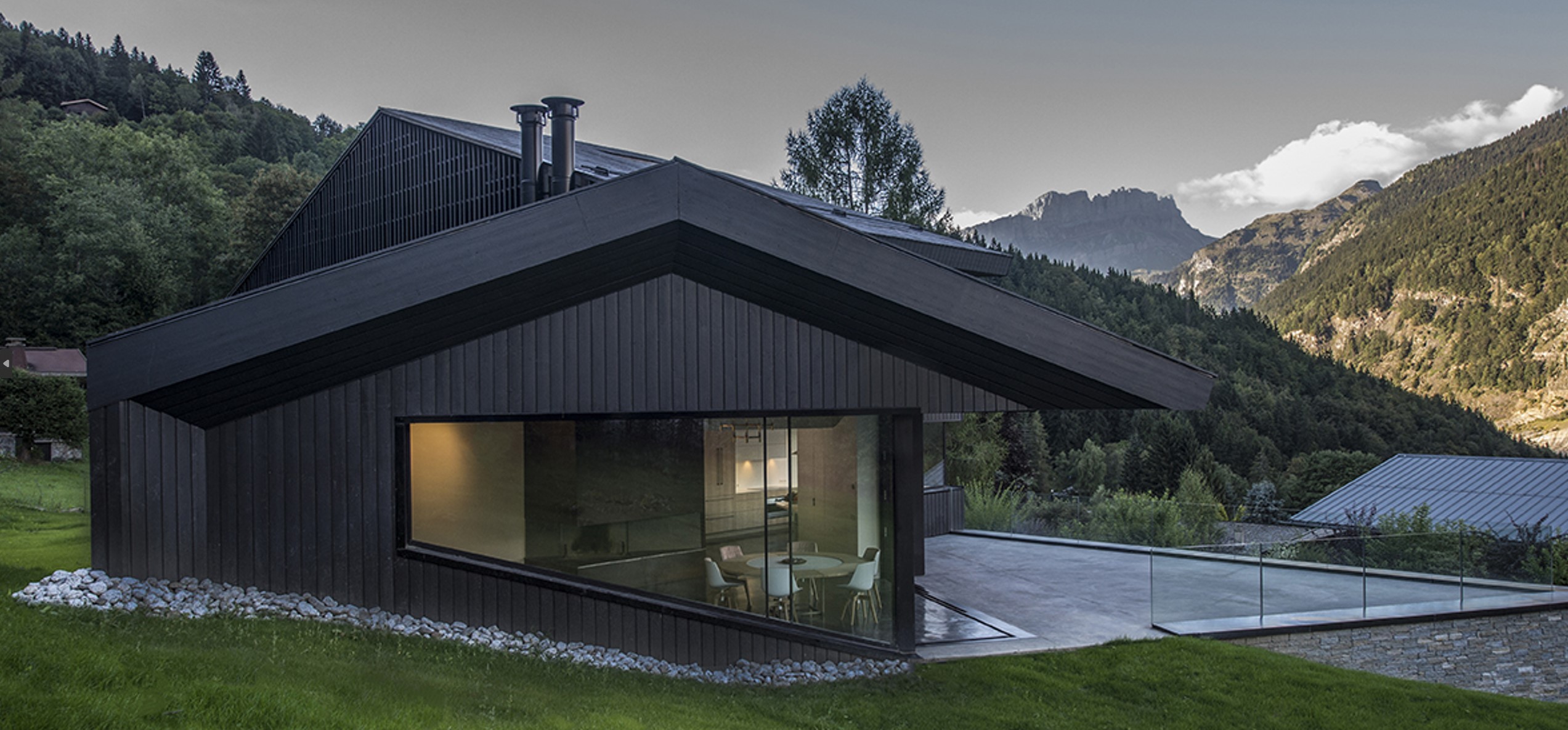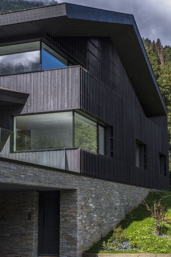 Le projet se structure autour de deux axes majeurs : la mise en valeur de la vue et la recherche d’un ensoleillement maximal. L’utilisation d’un héliodon permet d’étudier précisément l’ensoleillement du site et du bâtiment. La modélisation in situ offre par ailleurs une simulation fine de l’éclairement naturel dans les futurs espaces. Conçu avec une isolation mixte, le bâtiment adopte une structure entièrement en béton revêtue d’un bardage en mélèze brûlé. Disposé à claire-voie sur les façades principales, ce bardage préserve les vues depuis les pièces humides des chambres situées aux niveaux rez-de-chaussée et R+1. Le mélèze reçoit un traitement par brûlage et fixation de teinte permettant d’éviter tout dépôt de suie.