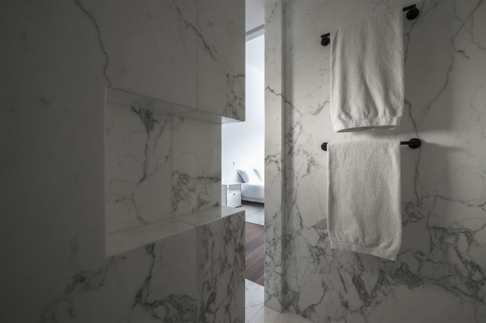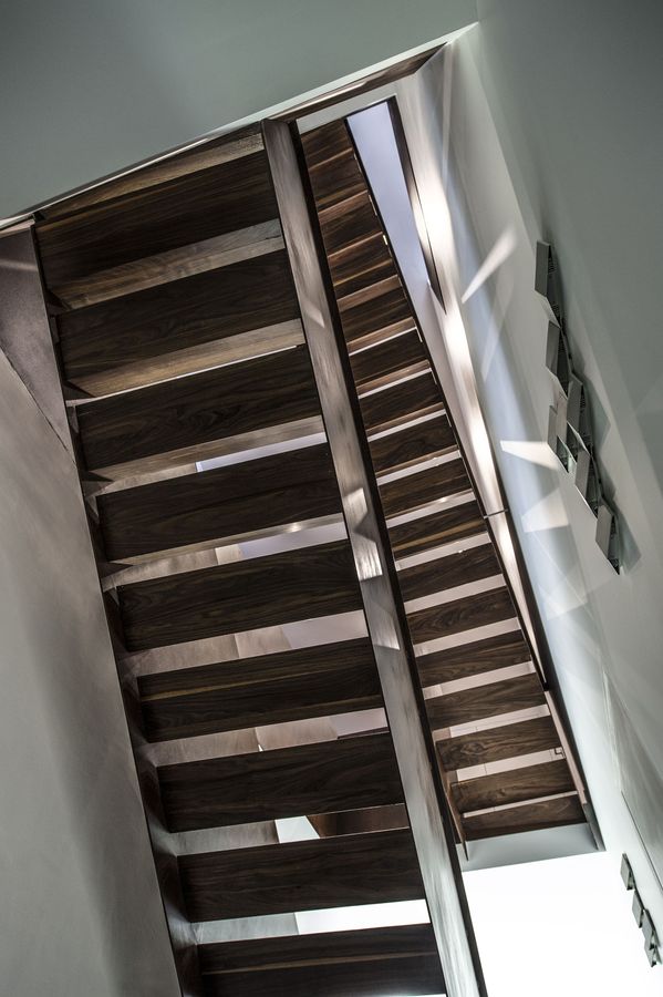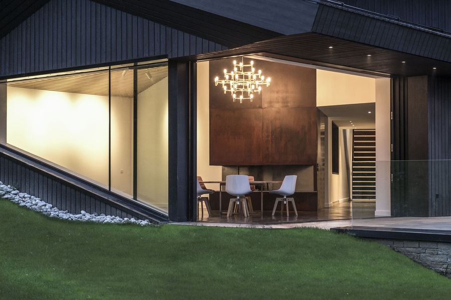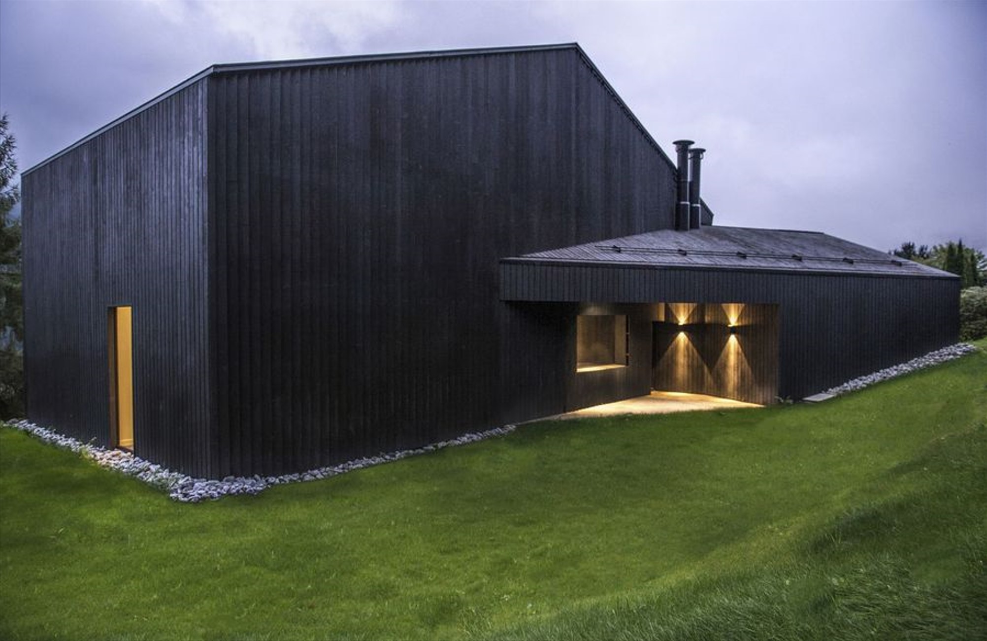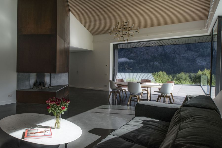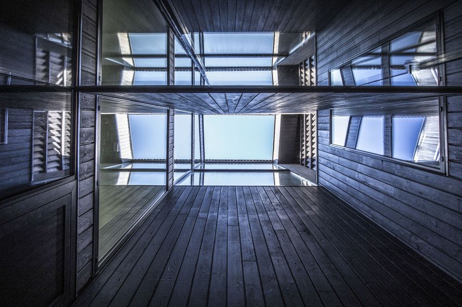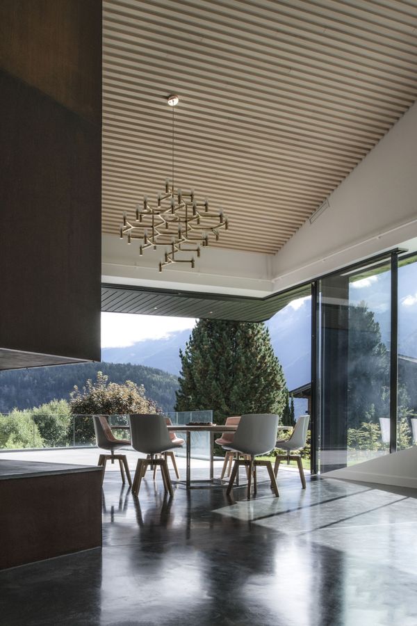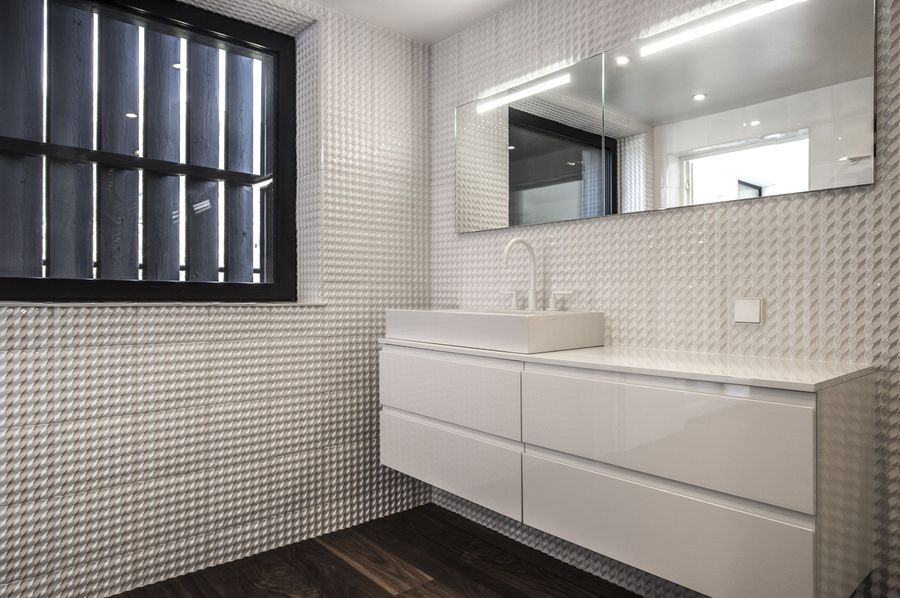 Le projet se structure autour de deux axes majeurs : la mise en valeur de la vue et la recherche d’un ensoleillement maximal. L’utilisation d’un héliodon permet d’étudier précisément l’ensoleillement du site et du bâtiment. La modélisation in situ offre par ailleurs une simulation fine de l’éclairement naturel dans les futurs espaces. Conçu avec une isolation mixte, le bâtiment adopte une structure entièrement en béton revêtue d’un bardage en mélèze brûlé. Disposé à claire-voie sur les façades principales, ce bardage préserve les vues depuis les pièces humides des chambres situées aux niveaux rez-de-chaussée et R+1. Le mélèze reçoit un traitement par brûlage et fixation de teinte permettant d’éviter tout dépôt de suie.