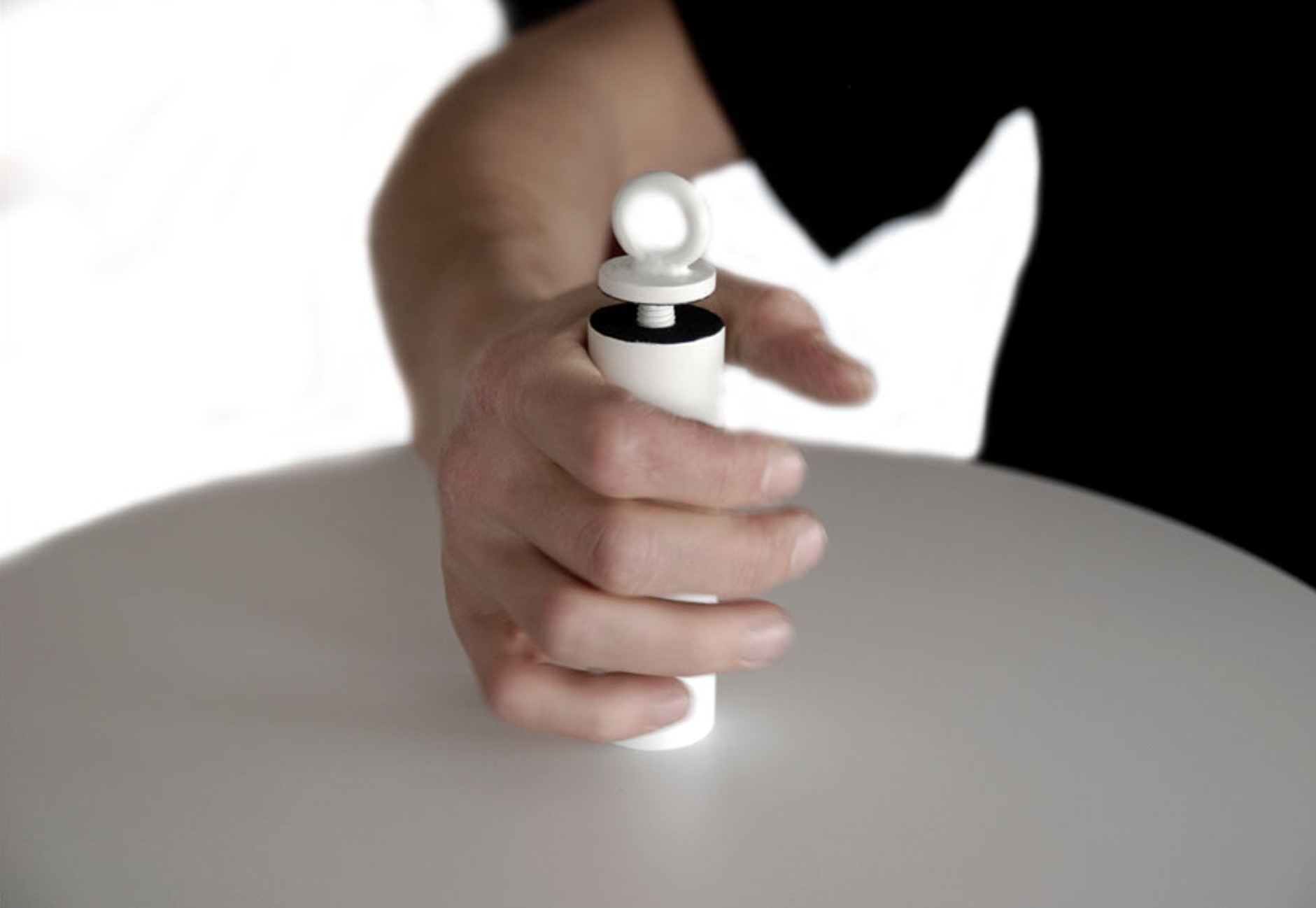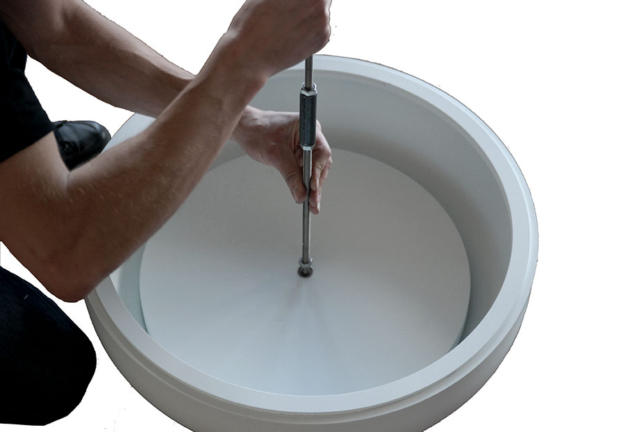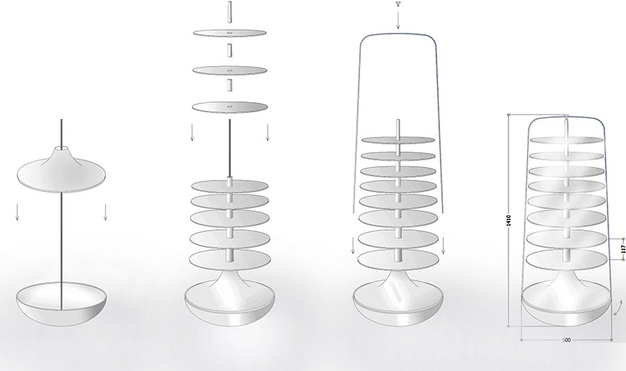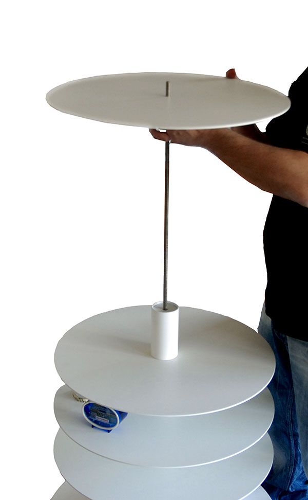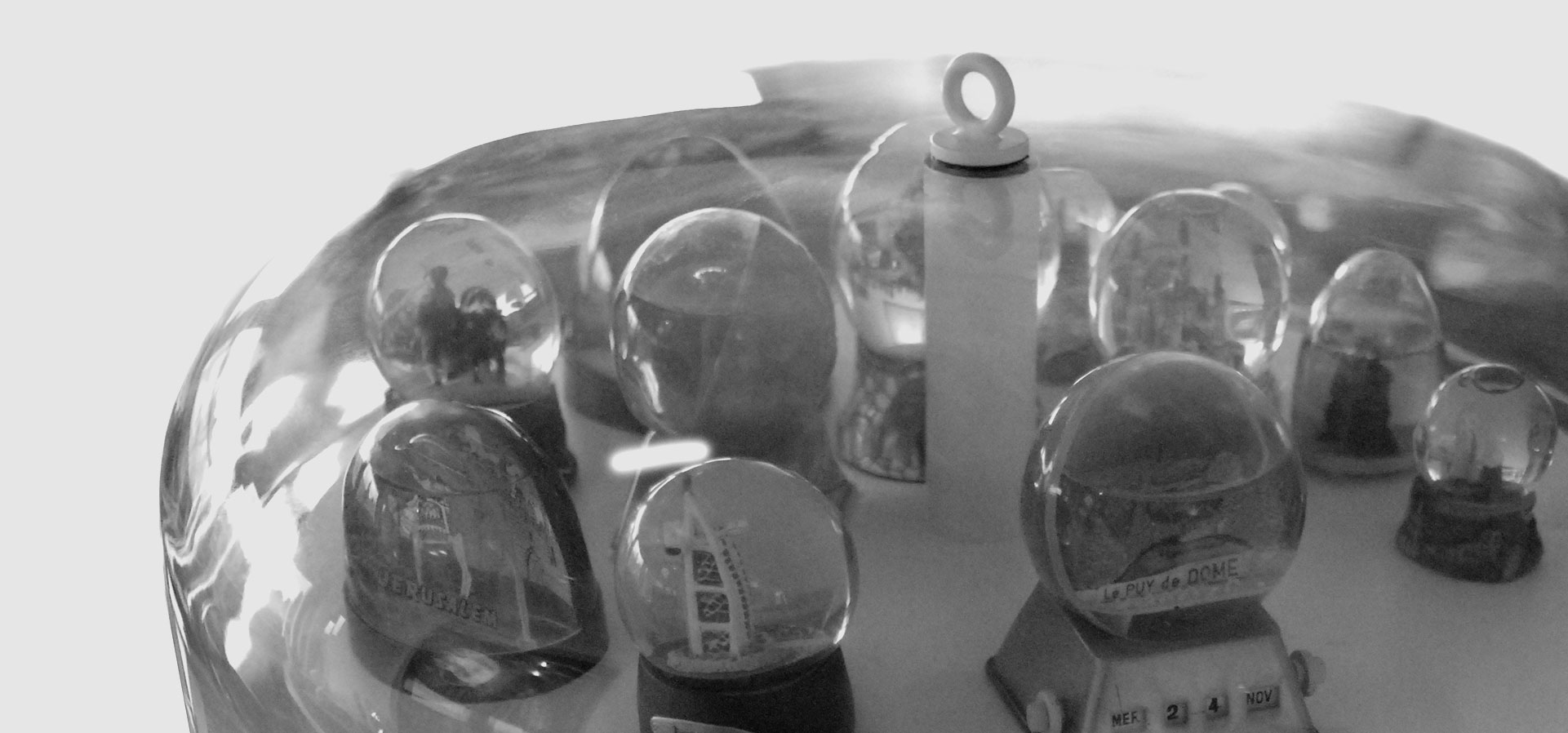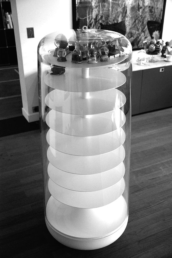 Travaillant autour des thèmes du mouvement et de l’enfance, le projet du culbuto a ainsi vu le jour. Alliant la possibilité de faire bouger les boules tout en les protégeant de la poussière, le culbuto oscille sur sa base. Réalisé en acier laqué et en plexiglas, il pèse environ 120 kilos sans les boules à neige. Sa base est constituée de plaques d’acier superposées. Le culbuto est mobile, se redresse seul et sans effort.