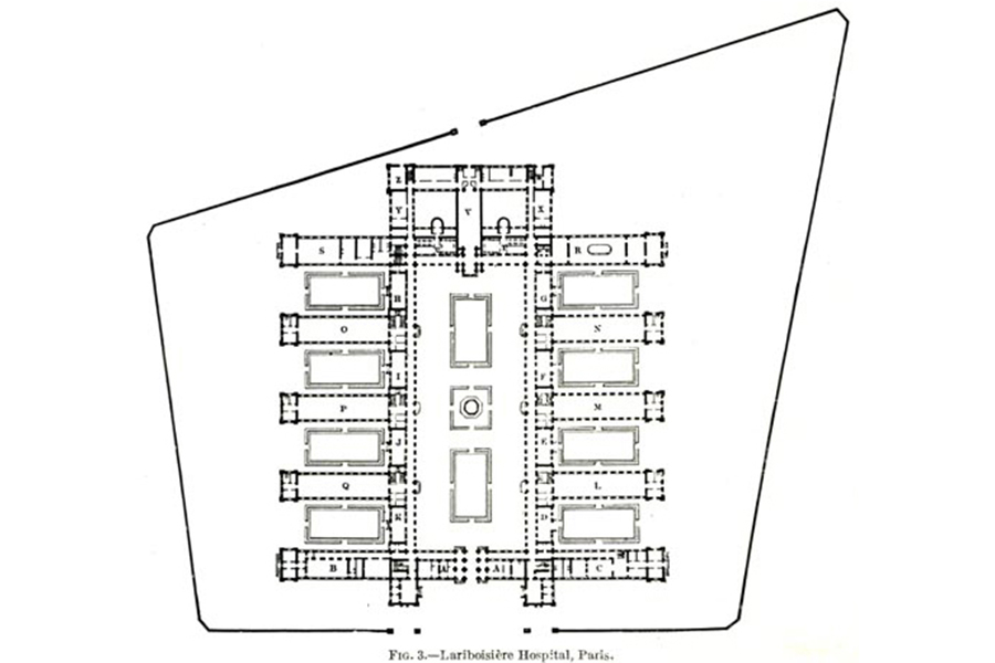 Le nouvel hôpital Lariboisière s’inscrit dans la continuité du premier hôpital de la rive nord de Paris, construit en 1854. À l’origine innovant dans sa conception, ce patrimoine, qui a diffusé le modèle du peigne, est aujourd’hui valorisé dans le schéma directeur étudié dans le cadre de notre mission de programmation.