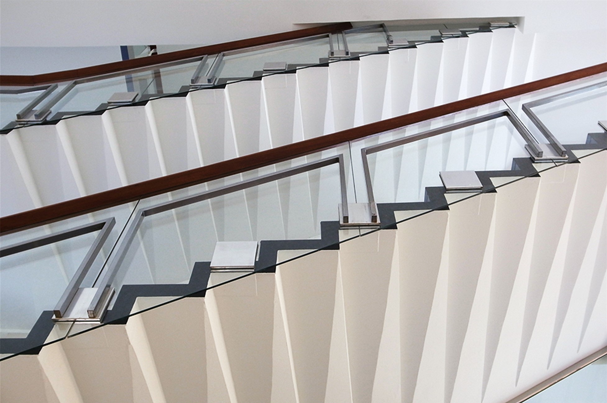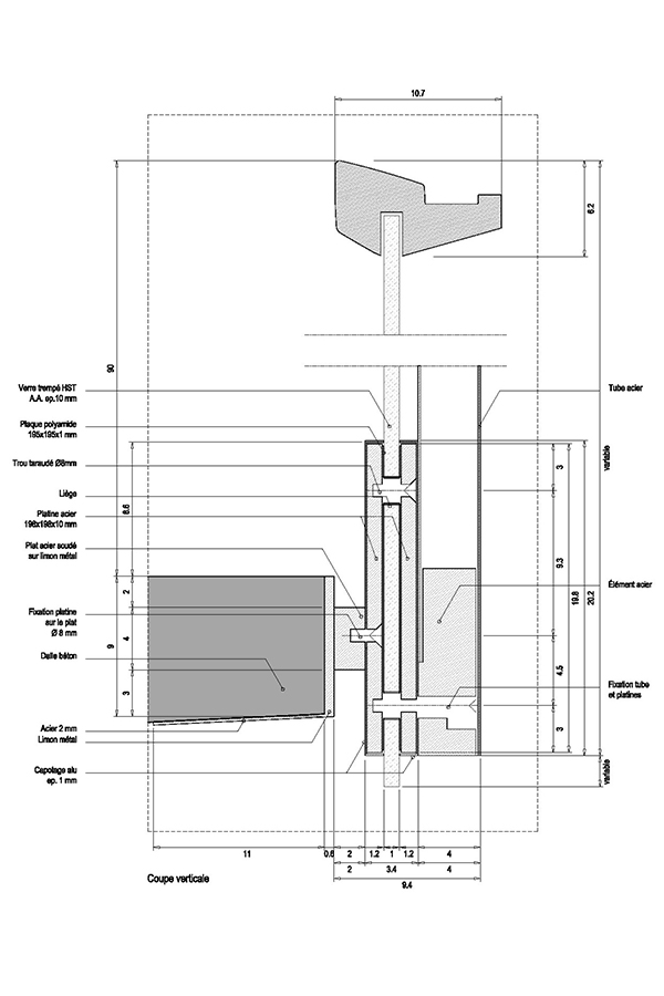 La première phase, dite de diagnostic, a permis de recenser l’ensemble des pathologies et d’en hiérarchiser le degré d’importance. La question de la cohérence de l’ensemble et de la restitution d’un état conforme au projet initial fait partie de la demande de la maîtrise d’ouvrage. En seconde phase d’études, nous avons proposé un projet répondant à cette attente, tout en intégrant le respect des règles de sécurité actuelles, aujourd’hui non satisfaites. Nous avons notamment proposé la reprise complète des dispositifs de fixation des feuilles de verre constituant le remplissage des garde-corps, ainsi que leur remplacement par du verre armé.