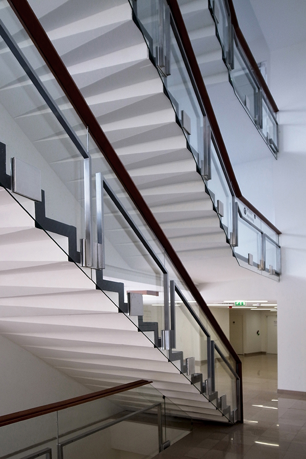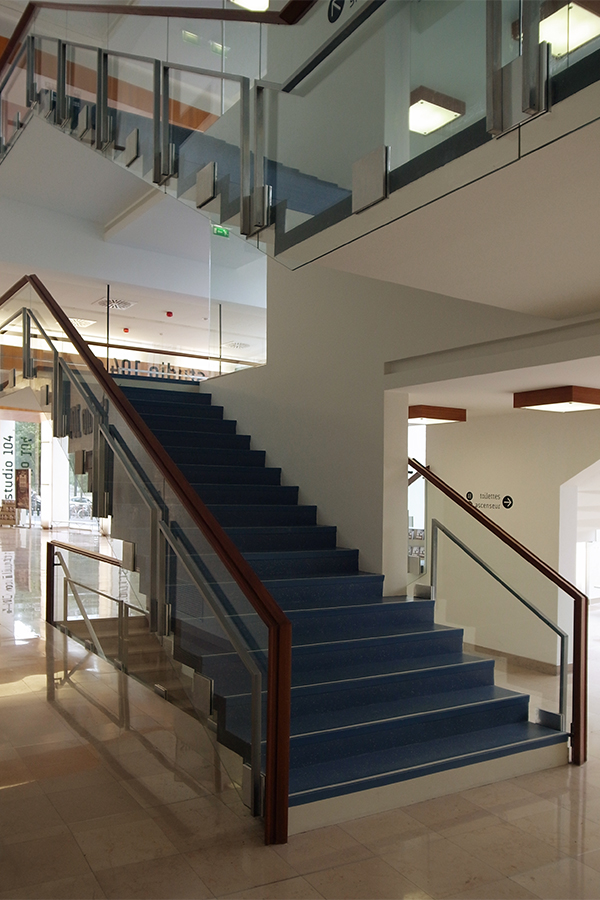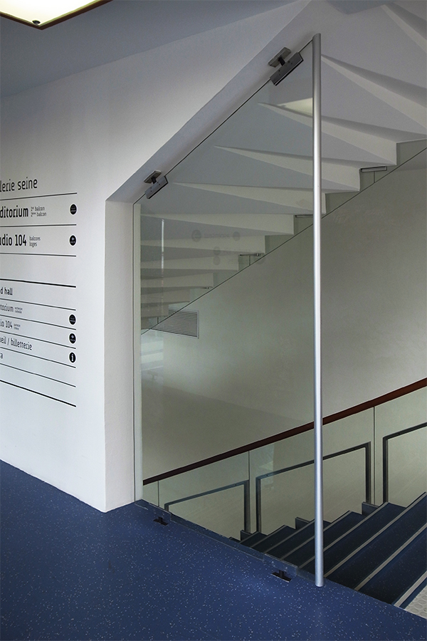 Le respect des dispositions existantes a prévalu sur un retour à l’état initial, qui aurait entraîné la disparition des arceaux en inox marquant fortement l’ensemble architectural. Le projet s’attache également à la réfection complète des sols récemment posés, lesquels ne donnent pas satisfaction du point de vue de la qualité de mise en œuvre et du confort esthétique. Notre proposition a recherché une solution garantissant à la fois la qualité d’exécution et le respect du projet initial. La pose de contremarches en tôle d’acier laquée noire et la mise en œuvre d’un sol souple de teinte claire redonnent le caractère contrasté du projet livré à l’origine.