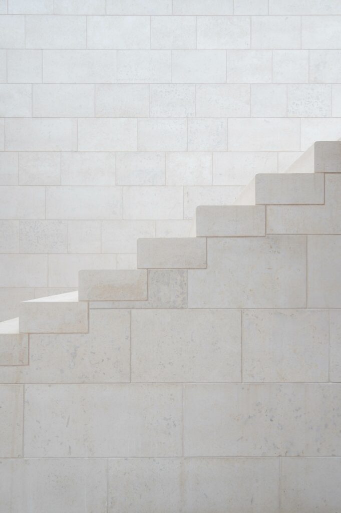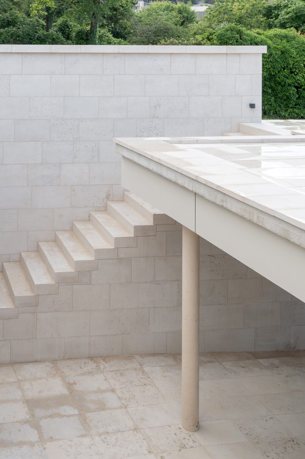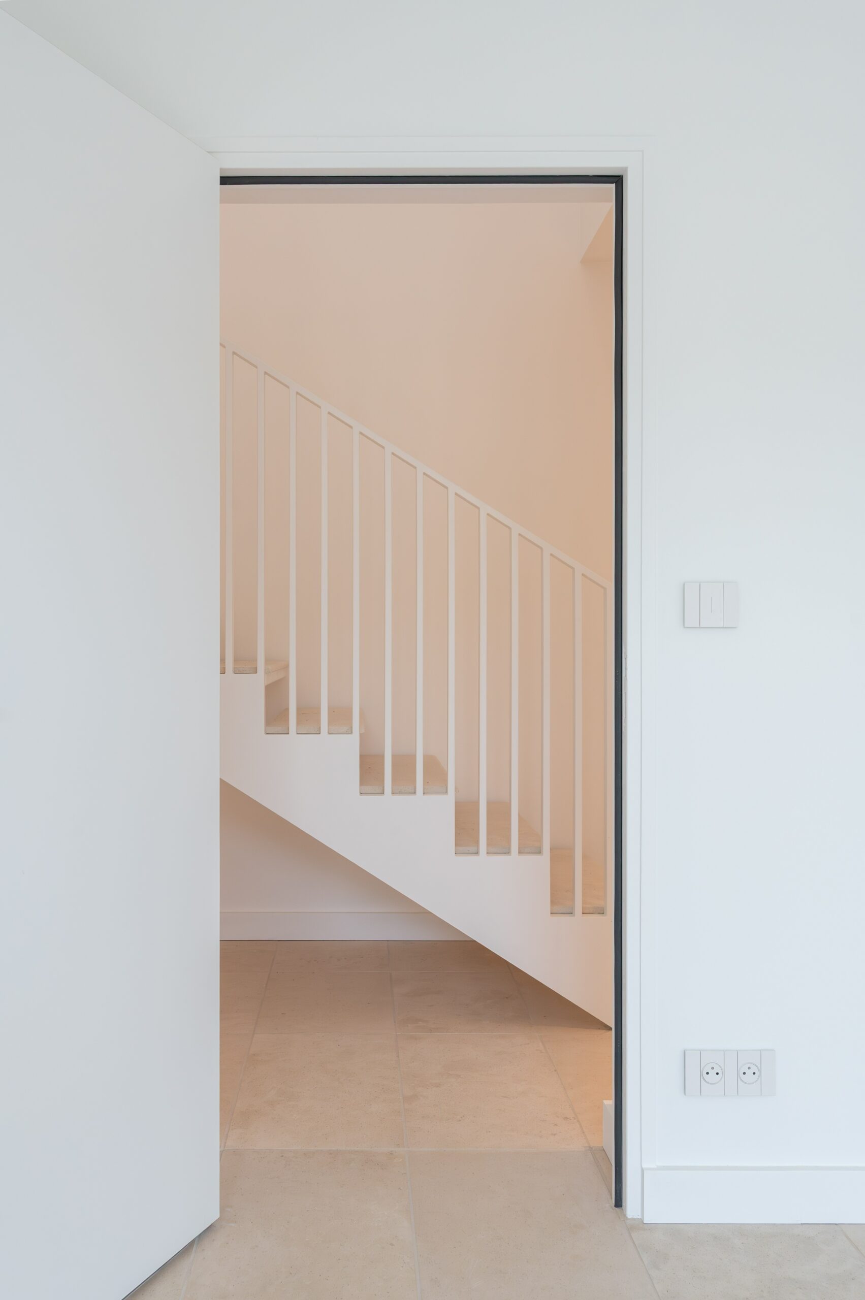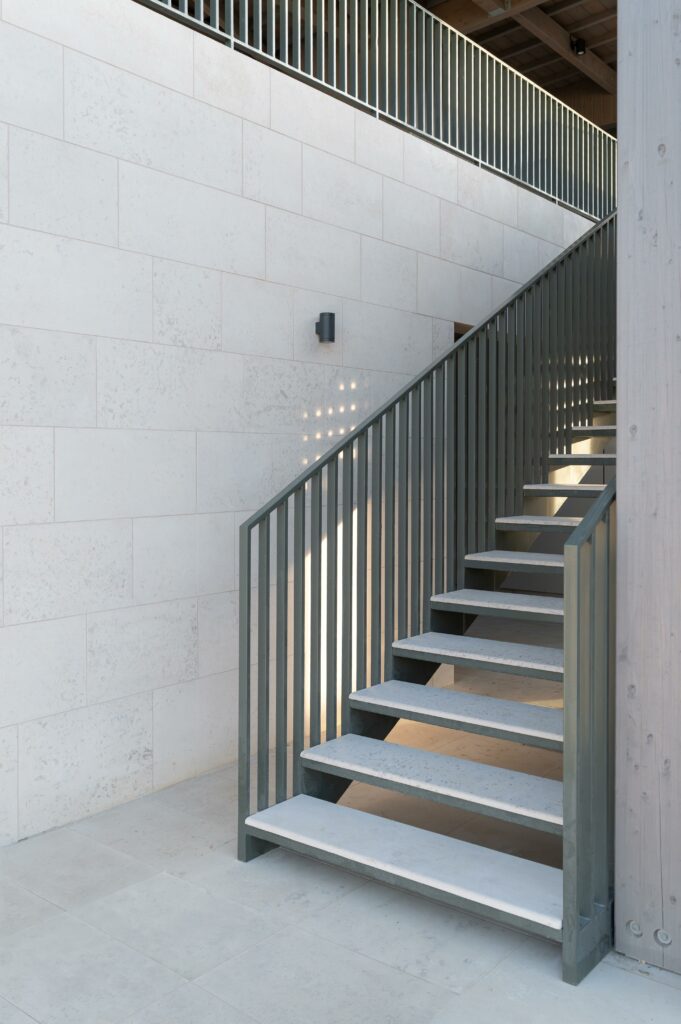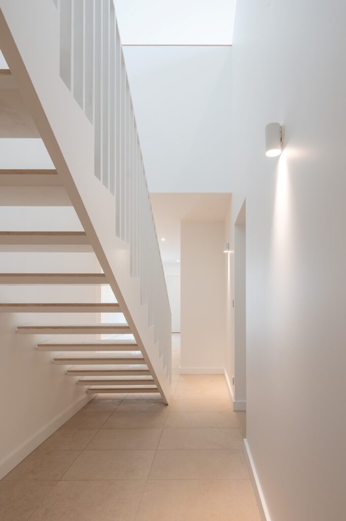 La maison, bercée par cet environnement, s’organise autour de percées visuelles et de larges baies laissant entrer le paysage à l’intérieur. Le projet se développe sur deux niveaux et accueille quatre chambres. La topographie du terrain, très marquée, a dicté un important travail d’intégration dans la pente. Les trois escaliers intérieurs et extérieurs apparaissent comme des points architecturaux charnières entre les volumes et les espaces.
