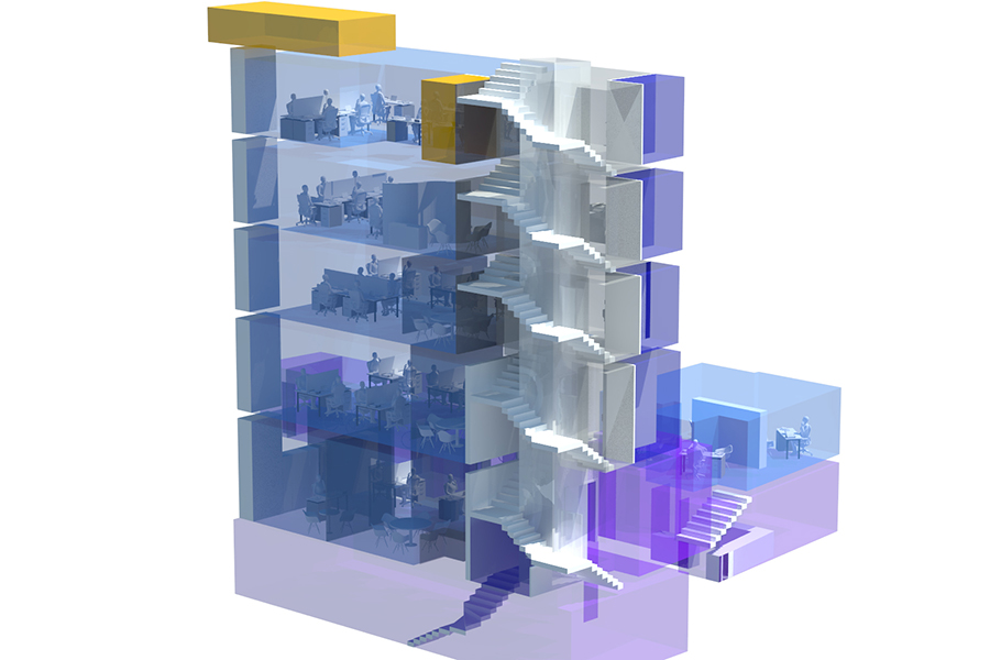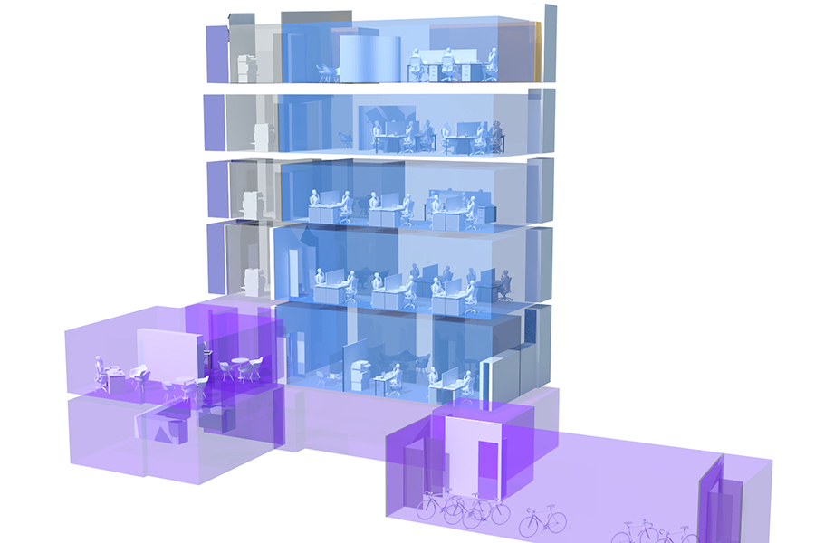 L’agence a formulé des propositions d’extension par surélévation du bâtiment, dans le respect des contraintes du PLU et du bâti avoisinant. Le projet intègre également une proposition de requalification des espaces du hall, assurant la distribution depuis la rue. Ces volumes distributifs représentent une surface significative qu’il convient d’intégrer pleinement dans la réflexion programmatique. La proposition architecturale reprend les valeurs et les caractéristiques de l’entreprise et développe un accueil écoresponsable, porteur d’une forte valeur ajoutée environnementale. Enfin, une attention particulière est portée au respect de l’architecture existante et à son dialogue avec une superstructure contemporaine.